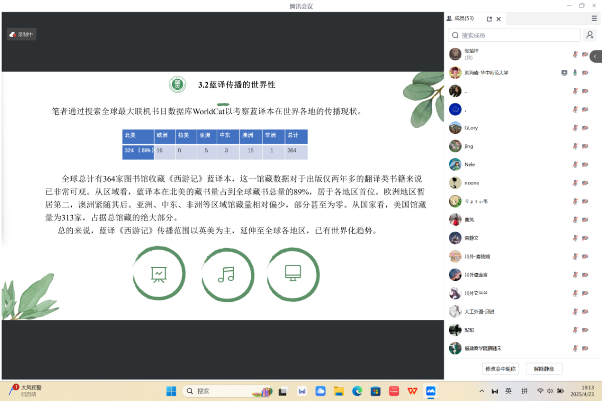4月23日晚七点,巴别译谭第二十三讲以线上会议的形式拉开帷幕。本次译谭由四川外国语大学翻译学院在读博士、商务英语学院教师甘姝姝主持,特邀江南大学朱义华副教授、重庆交通大学曹凤博士和福建商学院薛韪禾博士点评,来自华中师范大学、西南大学和四川外国语大学的三位在读博士研究生做学术分享,历时一个半小时,吸引了国内多所院校的师生近百人参加。