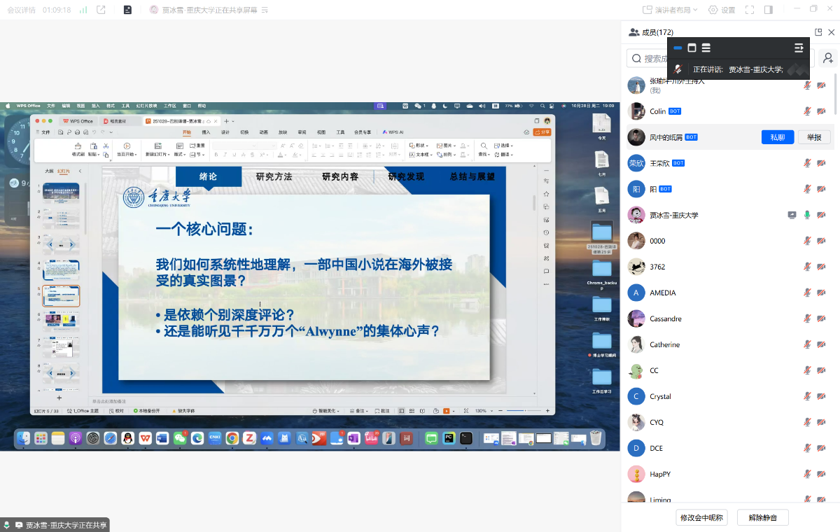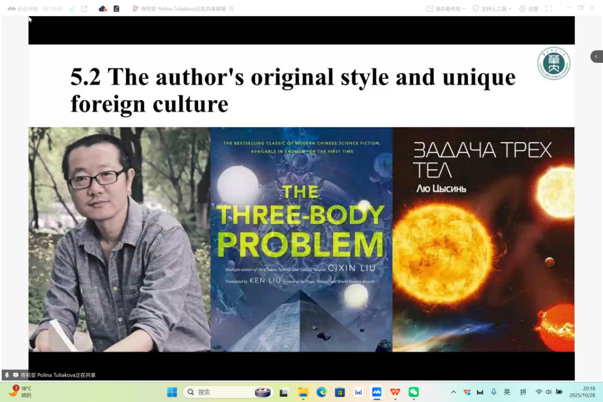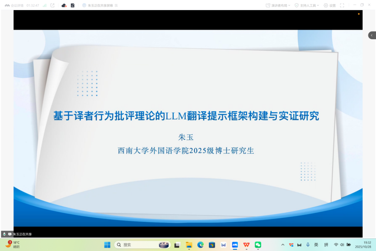 三位博士生依次做学术分享。首先是贾冰雪博士带来的《<异兽志>英译本海外读者接受研究——基于Python数据分析技术》主题汇报。第二位是朱玉博士发言,汇报题目是《基于译者行为批评理论的LLM翻译提示框架构建与实证研究》。第三位是Tuliakova Polina博士就On the Dissemination and Acceptance of the Translation of Liu Cixin’s The Three-Body Problem in Russia进行主题汇报。