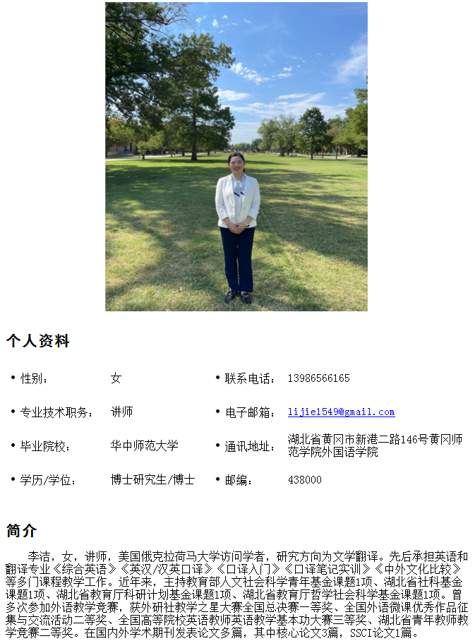 李洁,黄冈师范学院副教授,华中师范大学文学博士,俄克拉荷马大学访问学者。研究方向为文学翻译,近年来,主持教育部人文社会科学青年基金课题1项、湖北省社科基金(后期资助)课题1项、湖北省教育厅科研计划基金课题1项、湖北省教育厅哲学社会科学基金课题1项。曾多次参加各级别外语教学技能竞赛,累计获奖20余项。曾获外研社教学之星大赛全国总决赛—等奖、全国外语微课优秀作品征集与交流活动二等奖、全国高等院校英语教师英语教学基本功大赛三等奖、湖北省青年教师教学竞赛二等奖。在国内外学术期刊发表论文10篇,其中核心论文3篇,SSCI书评文章2篇。