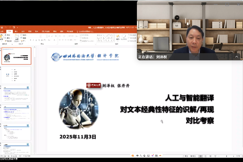 11月3日晚,河南大学刘泽权教授受邀线上开展了“人工与智能翻译对文本经典性特征的识解呈现对比考察”的学术讲座。来自全国多所高校近三百余名师生参与本场讲座,现场氛围专业严谨而不失轻松活跃。翻译协会会长赵新雷主持讲座。