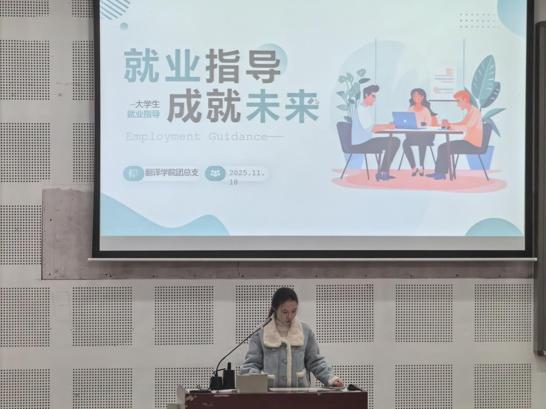 在专题宣讲环节,研究生团总支副书记丁雅琪以“就业指导,成就未来”为题,聚焦翻译专业学生的职业规划与求职准备。她分析了2025年全国高校毕业生达1222万人的就业形势,指出跨境电商、国际会展、本地化翻译等新兴领域对复合型翻译人才的需求,并针对学生中常见的“语言能力与行业知识脱节”“实践经验不足”等问题提出应对建议。丁雅琪从自我认知、观念准备、心理调适、能力储备四个维度展开讲解,强调要树立“翻译+”的跨领域发展理念,鼓励通过课程项目、实习实训积累实战经验。在简历优化环节,她详细介绍了如何突出CATTI证书、翻译工具运用、双语表达能力等专业优势,并分享了“精准关联、数据支撑、突出专长”的实用技巧,助力学员增强就业竞争力。