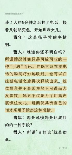原文写道:所谓愤怒,其实只是可放可收的一种“手段”而已。 它既可以在接电话的瞬间巧妙地收起,也可以在挂断电话后再次释放出来。这位母亲并不是因为怒不可遏而大发雷霆,她只不过是为了用高声震慑住女儿,使其听话,才采用了愤怒这种感情。