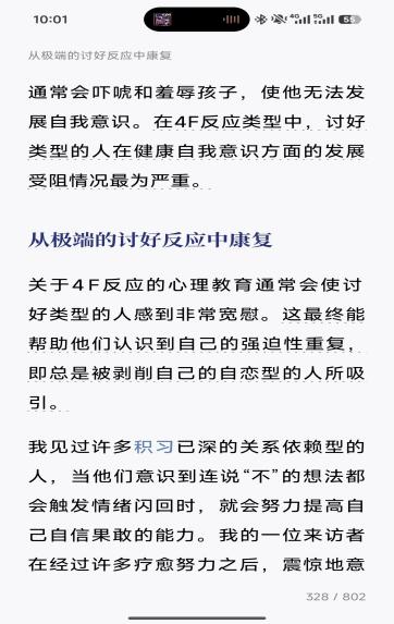 最触动我的是,我终于看懂了自己那些“改不了”的性格,原来都是创伤留下的4F生存反应。那些习惯性讨好、不敢说“不”、总怕得罪人的样子,并非我天生懦弱,而是童年为了活下去练出来的防御机制。