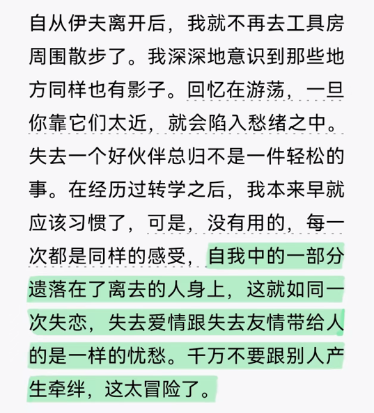 而最后那句“千万不要跟别人产生牵绊,这太冒险了”,曾成为我封闭自己、不愿敞开心扉的借口。因为牵绊越深,分离时带走的那部分自我就越多。
