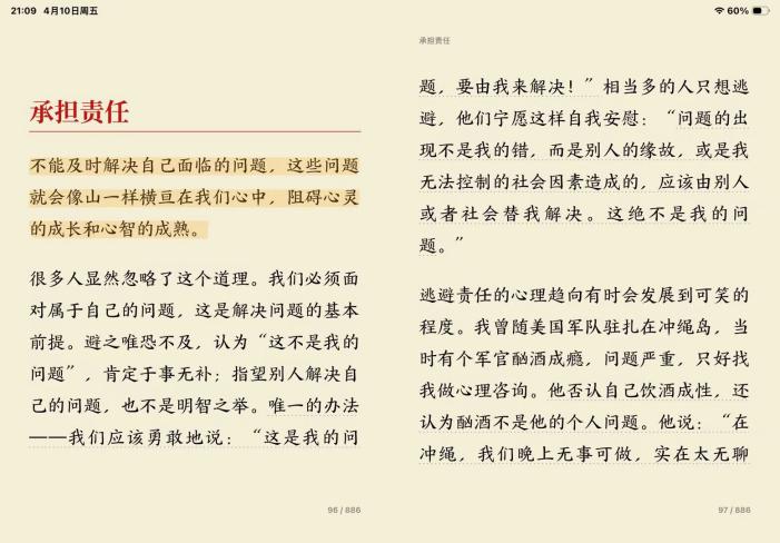 我今天阅读的是《少有人走的路》第一章,划线的那段文字可以说是一语中的。有时候事情太多、忙不过来,就会觉得自己什么都做不好。一到睡觉时,脑子里还在想要怎么完成这些事,不仅耽误睡眠,也扰乱心绪。但渐渐发现,想这些根本没用——只有迈出行动的第一步,不管完成度如何,心理负担就会减轻很多。
