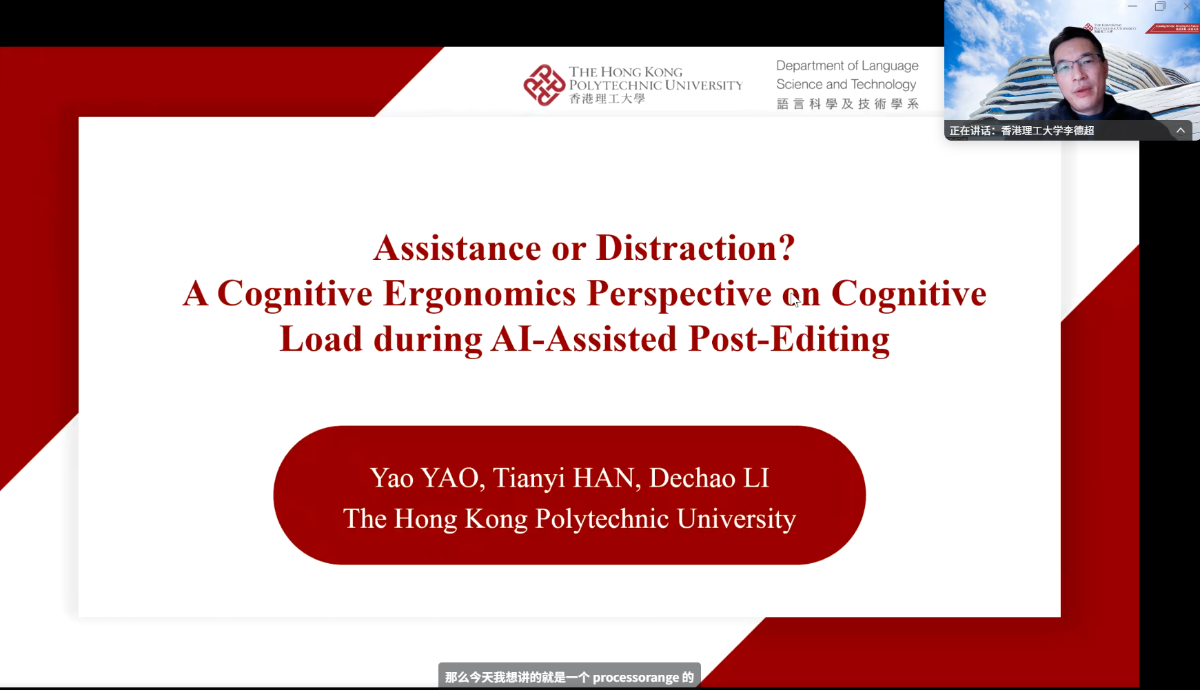 12 月 15 日晚,香港理工大学语言及科技学系李德超教授受邀莅临本协会,通过腾讯会议开展“AI时代的译后编辑:基于眼动技术的认知过程研究”学术讲座。本次讲座由四川外国语大学翻译学院指导、翻译协会主办,翻译协会会长赵新雷主持,来自全国多所高校的翻译专业师生齐聚云端,共同探讨AI与翻译认知的深度融合之道,现场学术氛围浓厚,互动交流热烈。