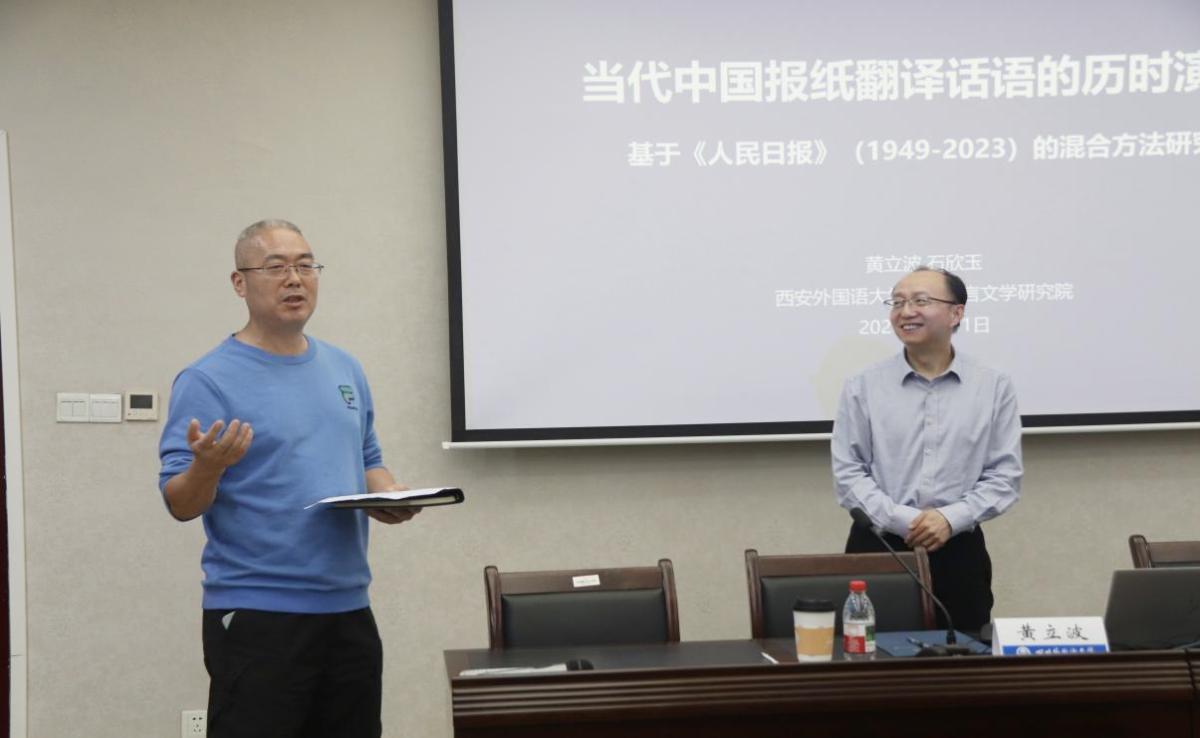 4月10日下午,西安外国语大学副校长、外国语言文学研究院院长、毛泽东著作翻译与传播研究中心负责人黄立波教授应邀为我院师生作了题为 “当代中国报纸翻译话语的历时演变:基于《人民日报》(1949-2023)的混合方法研究”的学术讲座。本次讲座由我院院长李金树教授主持。