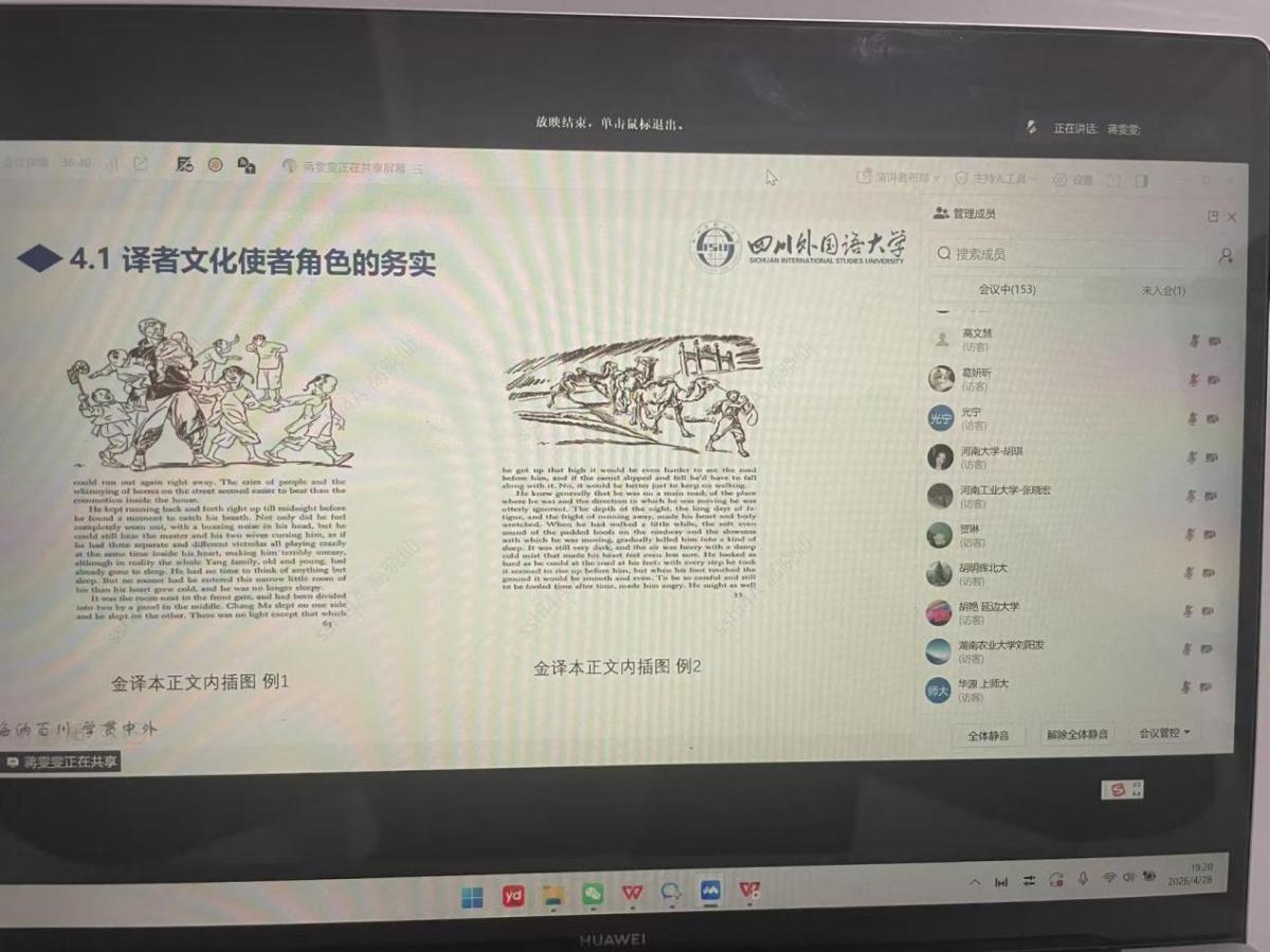 4月28日晚7点,巴别译谭第29讲以线上会议的形式如期举行。本次译谭由四川外国语大学翻译学院在读博士研究生高晓仙主持,特邀上海工程技术大学刘金龙教授、集美大学贺琳副教授担任点评嘉宾,来自四川外国语大学、西南大学的两位在读博士研究生分别做了学术分享。会议持续两个多小时,吸引了国内多所院校的近两百名师生在线参加。