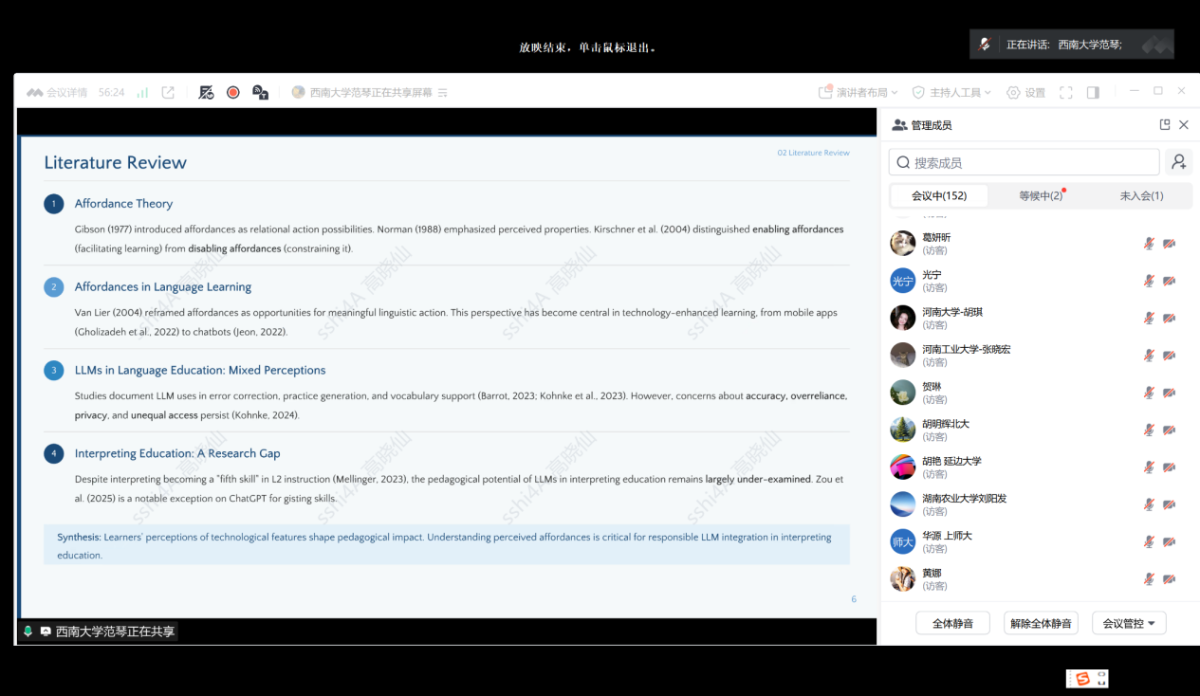 两位博士生依次做学术分享。第一位主讲人蒋雯雯(四川外国语大学博士生)汇报题目为《<骆驼祥子>英译译者角色差异与译本传播效果研究》;第二位主讲人范琴(西南大学博士生)汇报题目为《Exploring Perceived Affordances of Large Language Models in Interpreting Education: A Q methodology Study》。