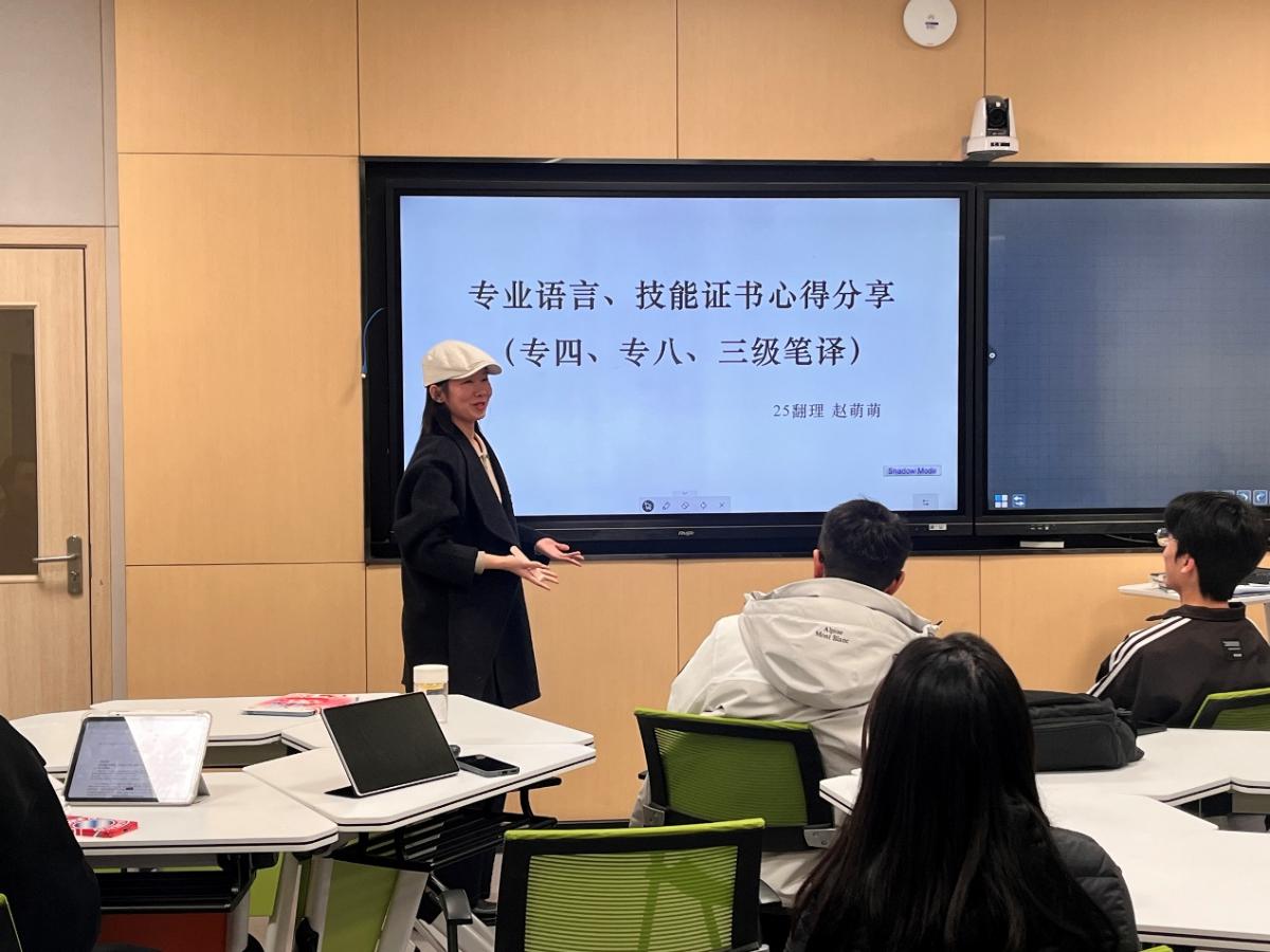 接着,赵萌萌同学围绕“如何系统备考专四、专八与CATTI三级笔译”分享了详实经验。她针对考试的不同题型特点,逐一剖析了不同板块的重难点。在临场技巧方面,赵萌萌强调了时间分配重要性。随后,基于自身参与“大学生英语竞赛”等赛事的实战经历,她总结了竞赛的备赛要点,强调竞赛与等级考试在能力要求上的互补性。她的分享内容具体、实用性强,为成员们提供了清晰的备考指引。
