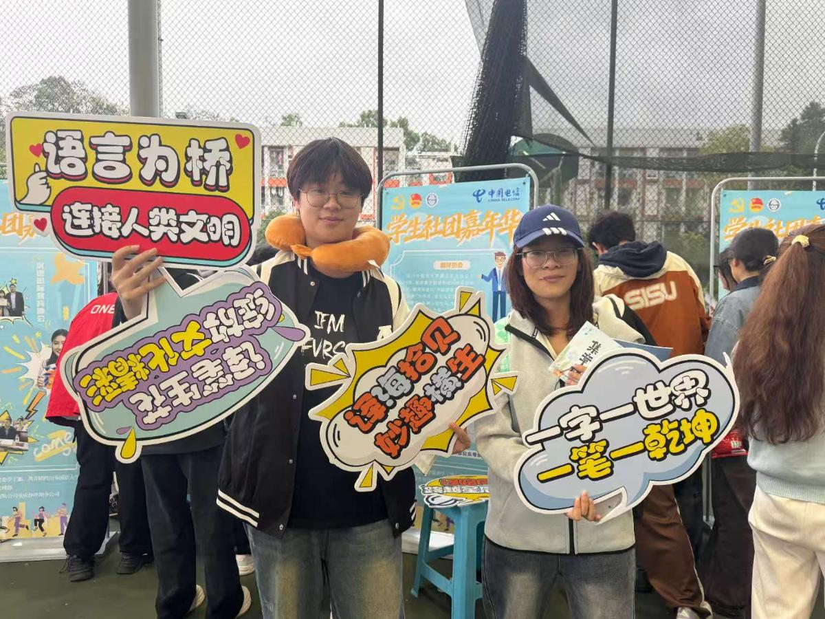 为了留下这难忘的瞬间,协会专门设置了创意拍照。同学们手持可爱的手举牌在展会前合影留念,并纷纷在社交媒体上分享。热情洋溢的笑容为嘉年华活动注入生机与活力,让翻译协会的跨文化魅力在线上也得到了广泛传播。