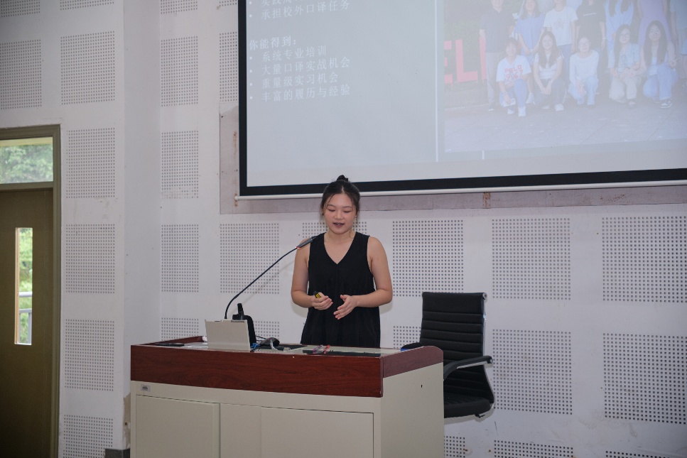 随后,多名高翻队队员分别从口译实践、志愿服务、证书考试三个方面进行了图文并茂的汇报。鲜馨同学以“相信自己、打磨自己、超越自己”为主题,讲述了自己从初入队伍到参与多场外事翻译的成长历程;王嘉琪同学则从实习与口译实践经历出发,分享了在外事部门实习、上合组织国家电影节及多场大型国际交流活动中的积累与收获。两人的精彩分享生动呈现了高翻队队员在实战中不断突破自我、追求卓越的过程。