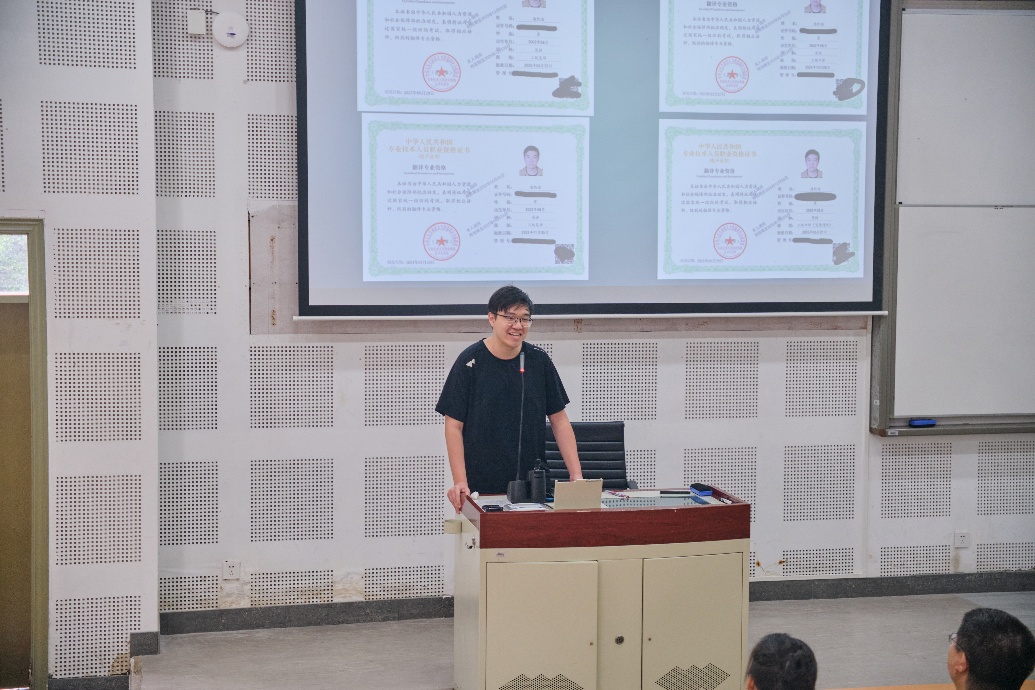 在翻译资格证书备考心得交流中,今年同时考取全国翻译专业资格证书(CATTI)二级口译和笔译证书的潘凯迪同学结合自身备考经验,系统介绍了CATTI二级和三级口笔译证书考试的准备方法,并分享了实用的学习策略与应试技巧。他表示,遵循科学的备考方法,加上持之以恒的练习,就一定能在学习中积累信心、在考试中取得突破。他鼓励同学们在积累中实现质的飞跃,以平常心迎接挑战,把每一次练习都当作迈向专业之路的坚实一步。