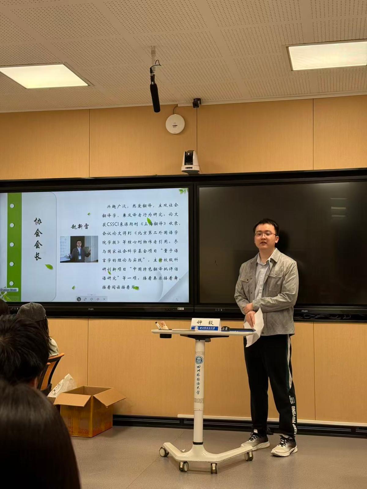 随后,翻译协会会长赵新雷发言。他向新成员的加入表示热烈欢迎,并从“国际视野、家园情怀和群体认同”等视角出发,阐述了当今翻译专业学生应当具备的三种素质。他以翻译之“用”向翻译之“为”的转向为题,启发大家思考人工智能时代翻译活动的功能与价值。